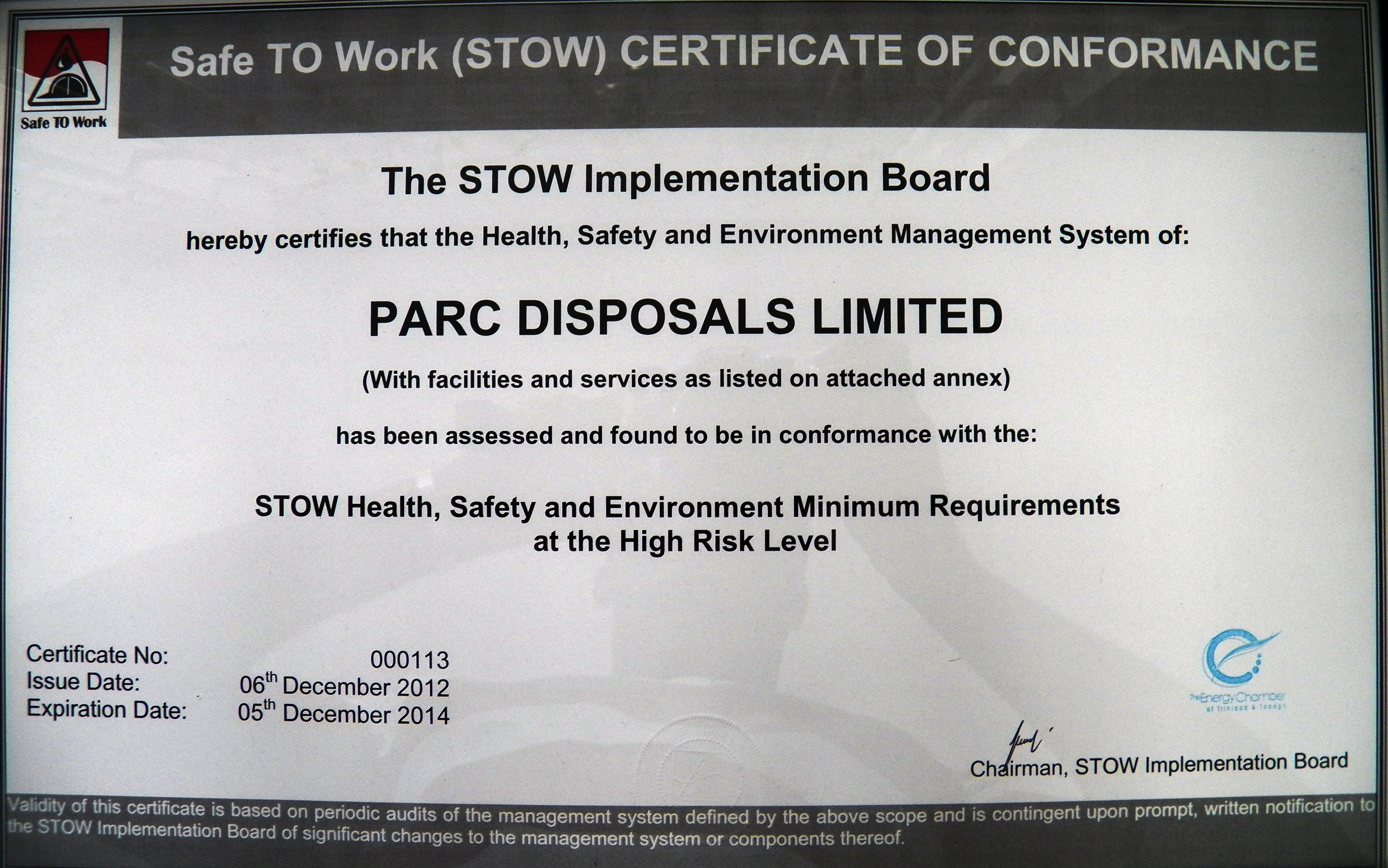 PARC Disposals Ltd. has always kept abreast with HSE policies and procedures that were of international standards for their industry. When the Energy Chamber of Trinidad & Tobago implemented the STOW Certification Programme, we at PARC Disposals knew that this certification would prove beneficial to our company.