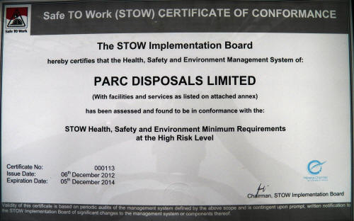 In November 2011, PARC Disposals Ltd. assembled a STOW implementation committee led by Mr. Josh Taylor. Their objective was to bring all of PARC Disposals Ltd's Operations and Management Systems up to a a level to meet the STOW requirements for High Risk Certification. In December 2012, PARC Disposals Ltd. was awarded STOW Certification for the High Risk Level